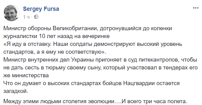 Министр внутренних дел Украины пригоняет в суд питекантропов, чтобы не дать сесть в тюрьму своему сыну, который участвовал в тендерах его же министерства", - пишет блогер и финансовый аналитик Сергей Фурса.