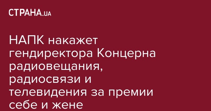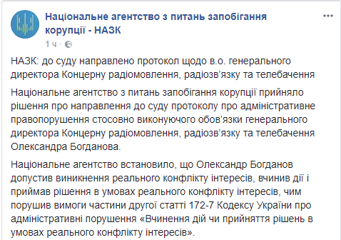 Нацагентство по вопросам коррупции (НАПК) передает в суд дело на и. о. гендиректора Концерна радиовещания, радиосвязи и телевидения Александра Богданова, который выделил себе и жене премии. Об этом сообщает пресс-служба НАПК.