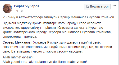 "В Крыму в автокатастрофе погибли Сервер Меннанов и Руслан Усманов. От имени Меджлиса крымскотатарского народа и себя лично выражаю искренние соболезнования родным и близким делегата Курултая крымскотатарского народа Сервера Меннанова и Руслана Усманова, спортсмена - тренера. Сервер Меннанов и Усманов Руслан останутся в памяти своих соотечественников свободолюбивыми, надежными и верными людьми, которые любили свою Родину и честно служили своему народу", - написал Чубаров.