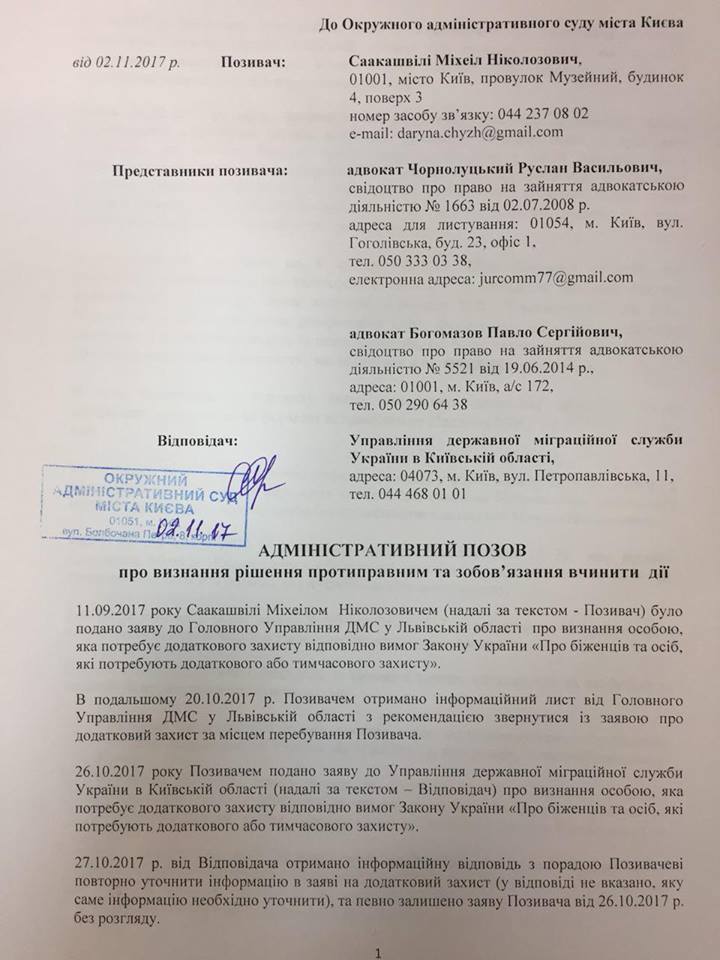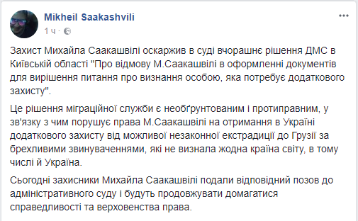 "Защита Михаила Саакашвили обжаловала в суде вчерашнее решение государственной миграционной службы в Киевской области "Об отказе М. Саакашвили в оформлении документов для решения вопроса о признании лицом, которое требует дополнительной защиты", - написал политик.