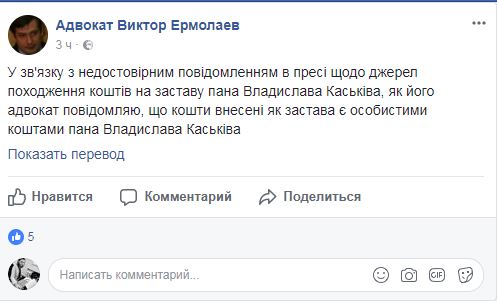 Позже он обнародовал пост в Facebook, в котором написал: "В связи с недостоверными сообщениями в прессе относительно источников происхождения средств на залог господина Владислава Каськива, как его адвокат сообщаю, что средства, внесенные как залог являются личными средствами господина Владислава Каськива".