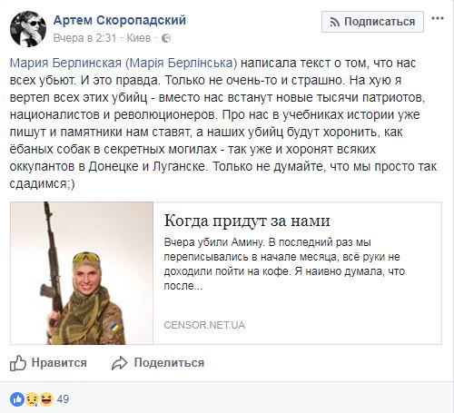 Пресс-секретарь "Правого сектора" Артем Скоропадский в связи с гибелью Амины Окуевой и покушением на Мосийчука заявил, что патриотов, националистов и революционеров "скоро убьют".