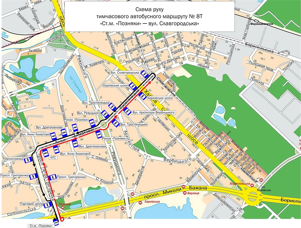 На этот период организуется движение автобусов временного маршрута №8Т "ст. м. "Позняки" - ул. Славгородская", который будет курсировать так: ул. Бажана - ул. П. Григоренко - ул. А. Ахматовой - ул. Тростянецкая (до ул. Славгородской) - ул. Тростянецкая - ул. А. Ахматовой - просп. П. Григоренко - просп. М. Бажана.