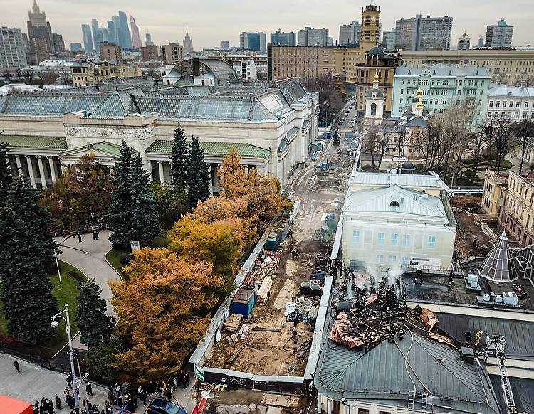 Из-за пожара в здании отдела личных коллекций ГМИИ им. А.С. Пушкина в центре Москвы перекрыто движение на улице Волхонке.