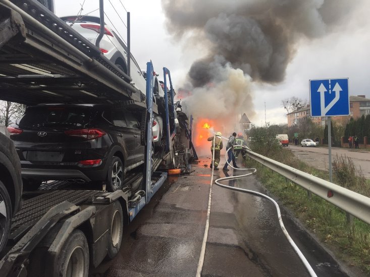 В 13.10 пожар удалось локализовать, а в 14:30 – полностью потушить. Огнем уничтожена кабина водителя, моторный отсек автомобиля DAF и шесть легковых автомобиля марки Hyundai Tucson.