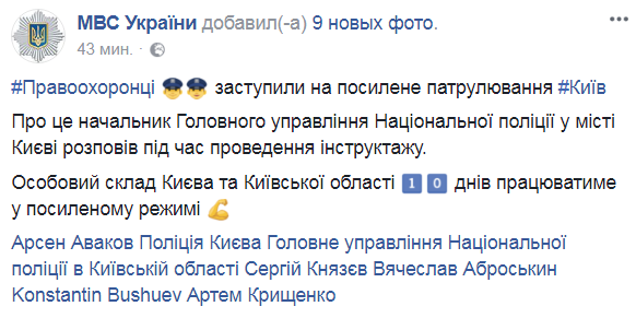 "Правоохранители заступили на усиленное патрулирование Киева. Об этом начальник Главного управления Национальной полиции в городе Киеве рассказал во время проведения инструктажа", - говорится в опубликованном вечером пятницы сообщении.