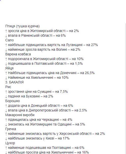 В Донецкой области сразу на 4 социальных продуктов цены выросли наибольшими темпами. В Киеве и Житомирской наиболее выросла цена на 3 наименования социальных продуктов, в Закарпатской и Черкасской облостях - по 2 наименования.