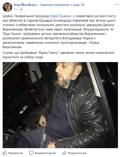 "Только что Генеральный прокурор Юрий Луценко в комментариях к моему посту об убийстве в Харькове Эдуарда Аксельрода сообщил о связи этого преступления с убийством бывшего депутата российской Госдумы Дениса Вороненкова. Оказывается именно из-за Аксельрода, больше известного, как "Эдик Лепа", происходила связь заказчика убийства Вороненкова - российского криминального авторитета Владимира Тюрина с организатором, руководителем преступной группы исполнителей - Юрием Василенко. Похоже, что убрав "Эдика Лепу" заказчик таким образом пытается подчистить за собой следы", - приходит к выводу нардеп Игорь Мосийчук.