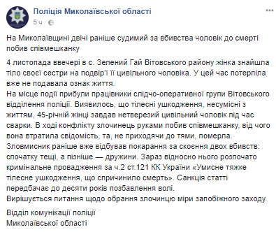 В Николаевской области мужчина, который отсидел срок за убил двух родственниц, забил до смерти сожительницу. Об этом сообщает пресс-служба полиции Николаевской области в Facebook.