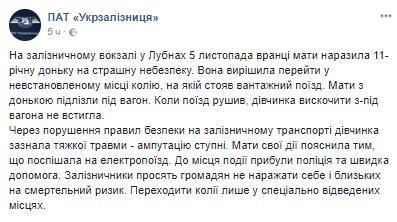 На железнодорожном вокзале в Лубнах Полтавской области мать с 11-летней дочерью пострадали, пытаясь перелезть участок дороги под вагоном. В результате девочка сильно пострадала. Об этом сообщает "Укрзализныця" в Facebook.