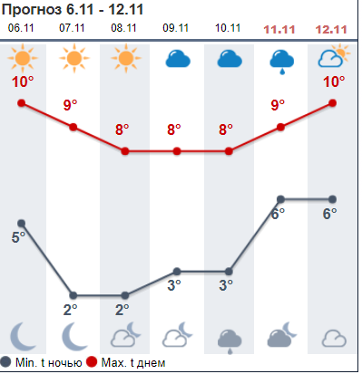 Сайт Sinoptik.ua считает, что без дождей все-таки не обойдется. Осадки вероятны в четверг и пятницу - 9 и 10 ноября. Дневная температура составит +6...+9.