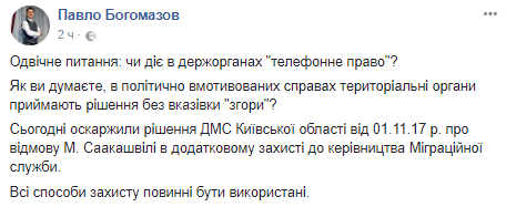 "Сегодня обжаловали решение Государственной миграционной службы в Киевской области от 1 ноября 2017 года об отказе Михаилу Саакашвили в дополнительной защите к руководству миграционной службы. Все способы защиты будут использованы", - написал адвокат.