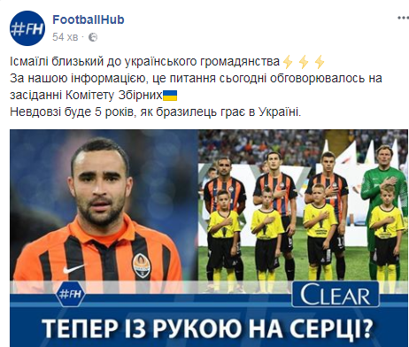 "Исмаили близок к украинскому гражданству. По нашей информации этот вопрос сегодня обсуждался на заседании Комитета сборных. Скоро исполнится пять лет как бразилец играет в Украине", - говорится в сообщении.