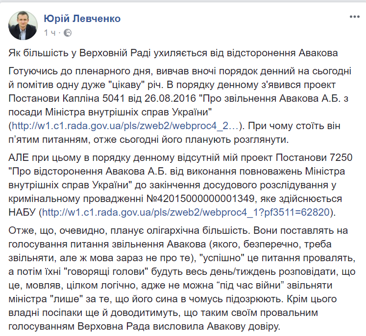 18:29  "Вместо того, чтобы поставить на голосование отстранение Авакова на время следствия, они вытащили старое постановление об увольнении, которое сами же и провалили".