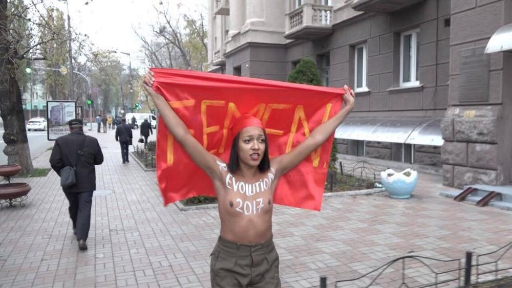 На обнаженной груди активистки написано "Revolution 2017".