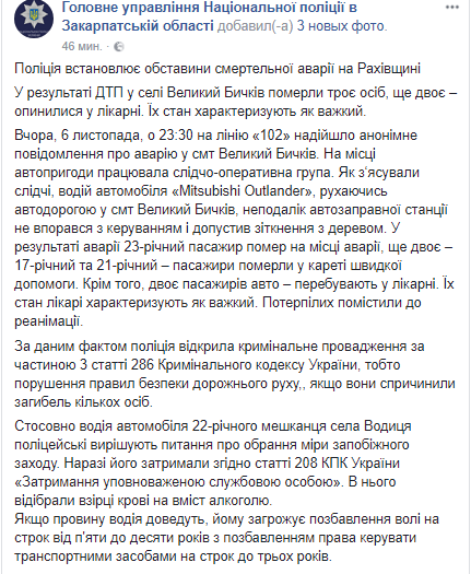 6 ноября, в 23:30 поступило анонимное сообщение об аварии в пгт Великий Бычков Раховского района. Выяснилось, что водитель Mitsubishi Outlander не справился с управлением. В результате столкновения с деревом 23-летний пассажир скончался на месте, еще двое - 17-летний и 21-летний - пассажиры умерли в карете скорой помощи.