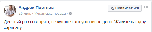 "Десятый раз повторяю, не куплю я это уголовное дело. Живите на одну зарплату", - написал Портнов.