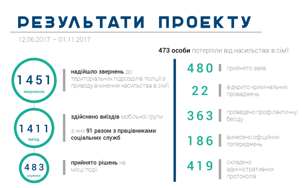 Отмечается, что пилотный проект с 12 июня 2017 года реализуется в Дарницком районе Киева, Малиновском районе Одессы и в городе Северодонецк Луганской области. За это время в территориальные подразделения полиции, где работает "Полина". поступило 1451 обращение по поводу совершения насилия в семье.