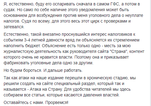 "И вот мне пришло уведомление о налоговом решении с требованием уплатить крупную сумму налогов. Я, естественно, буду его оспаривать сначала в самом ГФС, а потом в судах. Но само по себе наличие этого уведомления может быть основанием для возбуждения против меня уголовного дела о неуплате налогов. Судя по всему, для этого весь этот цирк с проверками и затевался", - считает главред "Страны".