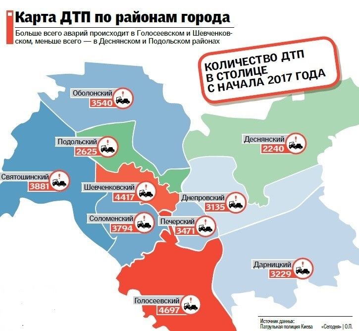 Самыми аварийными в столице стали Голосеевский и Шевченковский районы - всего 9 тыс. 114 ДТП с начала года. В антилидеры попали также Оболонский, Святошинский и Соломенский районы. ДТП тут происходят практически каждый день.