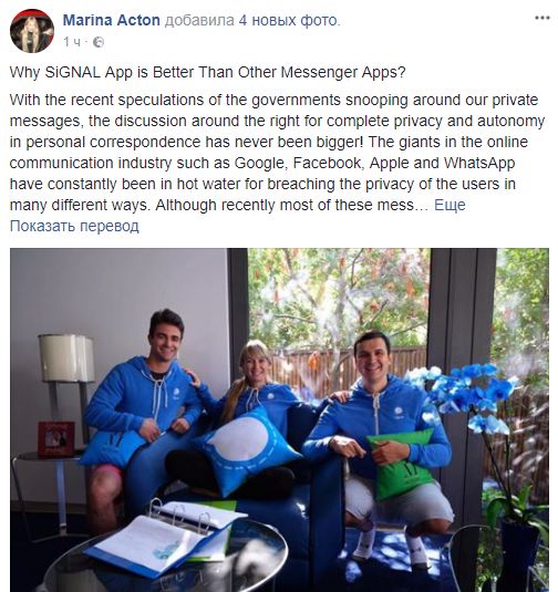 Два последних на данный момент поста Марины Актон посвящены новому мессенджеру и его разработчикам. Вполне вероятно, что она воспользуется повышенным в последнее время вниманием к своей особе и будет пиарить этот продукт через соцсети.