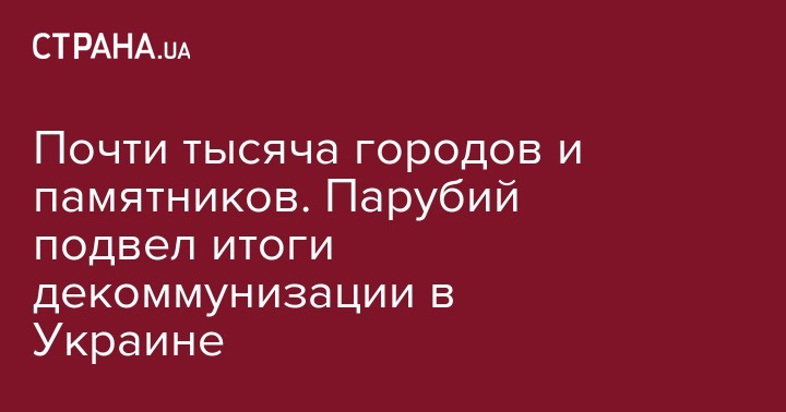 В рамках декоммунизации в Украине было переименовано 987 городов и деревень, свыше 50 тысяч улиц, демонтирован 1320 памятников Ленину и сотни других памятников, связанных с коммунистическим режимом. Об этом заявил спикер Рады Андрей Парубий, выступая на съезде партии "Народный фронт".