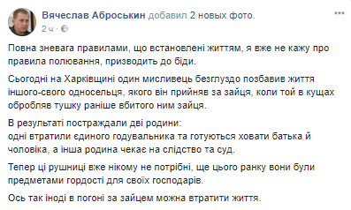 По словам Аброськина, охотник выстрелил в другого охотника, когда тот в кустах обрабатывал тушку ранее убитого зайца. Стрелявший решил, что это шуршит заяц. Убитый мужчина был односельчанином стрелявшего.