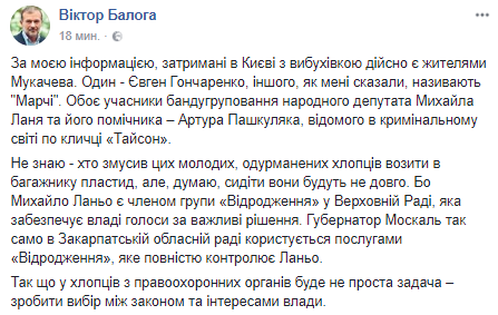 "По моей информации, задержанные в Киеве со взрывчаткой действительно являются жителями Мукачево. Один - Евгений Гончаренко, другого, как мне сказали, называют "Марчи". Оба участники ОПГ народного депутата Михаила Ланьо и его помощника - Артура Пашкуляка, известного в криминальном мире под кличкой Тайсон.