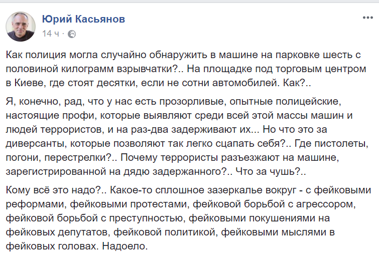 "Как полиция могла случайно обнаружить в машине на парковке шесть с половиной килограмм взрывчатки?.. На площадке под торговым центром в Киеве, где стоят десятки, если не сотни автомобилей. Как?..