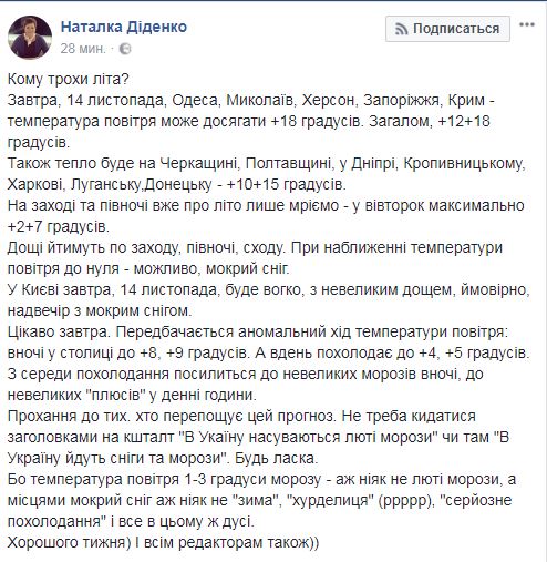 Об этом сообщает синоптик Наталья Диденко на своей странице в Facebook.