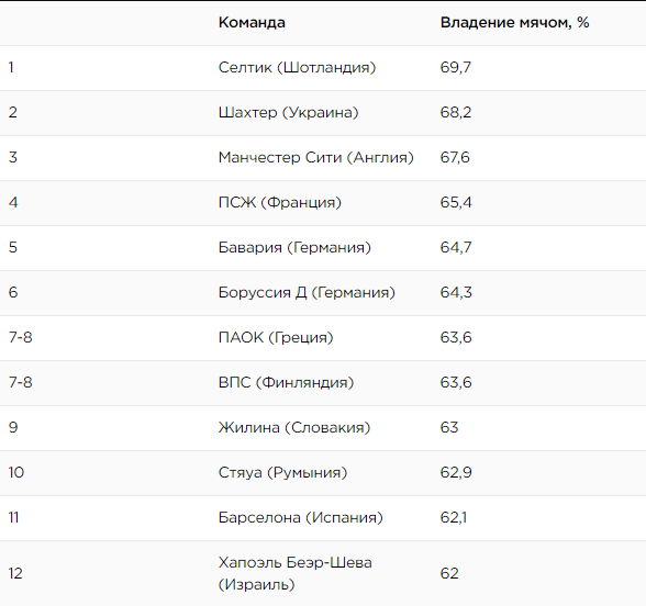 Что касается Шахтера, то он почти стал самой лучшей командой по показателю владения мячом. Горнякам удалось опередить в рейтинге Манчестер Сити Пепа Гвардиолы, который считается одним из приверженцев подобного стиля игры. Однако дончанам, а также Селтику удалось опередить "горожан" за счет наличия более слабых конкурентов в своих лигах, предпочитающих действовать вторым номером.