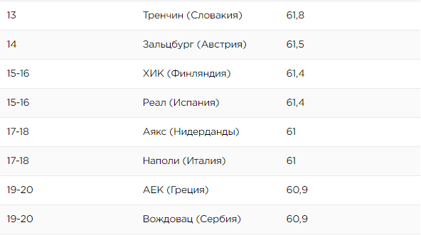 В этом рейтинге лидерами по странам следует считать Германию (Бавария и Боруссия Д заняли места в топ-10). Также двумя клубами представлены Словакия (Жилина и Тренчин), Греция (ПАОК и АЕК) и Испания (Барселона и Реал).