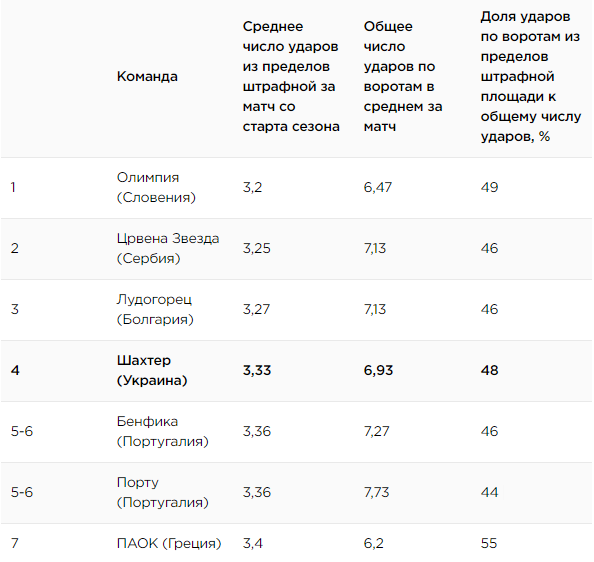В целом, следует обратить внимание, что показатели ударов по воротам из пределов штрафной площади являются одной из причин лидерства большинства из вышеуказанных клубов. В частности, лидеры чемпионатов Англии, Италии и Украины не позволяют проходить в собственную штрафную, минимизируя, тем самым, вероятность пропущенного гола.