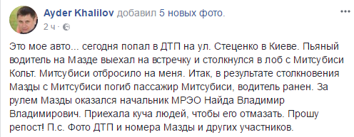 "Это мое авто... Сегодня попал в ДТП на ул. Стеценко в Киеве. Пьяный водитель на "Мазде" выехал на встречную и столкнулся в лоб с "Мицубиши Кольт". "Мицубиши" отбросило на меня. В результате столкновения "Мазды" с "Мицубиши" погиб пассажир "Мицубиши", водитель ранен. За рулем "Мазды" оказался начальник МРЭО Найда Владимир Владимирович. Приехала куча людей, чтобы его отмазать", - написал в Facebook Айдер Халилов.