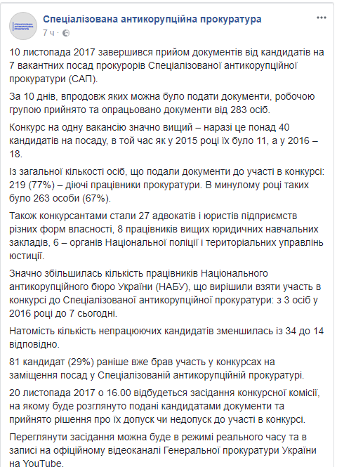 В Специализированной антикоррупционной прокуратуре закончили прием документов на 7 вакантных должностей прокуроров. Документы подали уже 283 человек, так что на одно место прокурора претендует более 40 кандидатов, сообщает САП в Facebook.