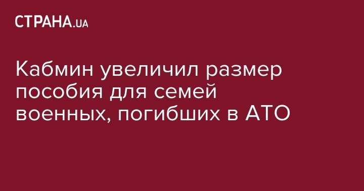 Кабинет Министров увеличил размер единоразовой денежной помощи семьям погибших участников антитеррористической операции (АТО) и получившим инвалидность во время участия в АТО лицам на 250 до 750 прожиточных минимумов. Об этом говорится в постановлении правительства №837 от 8 ноября, передают "Украинские Новости".