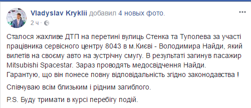 "Произошло ужасное ДТП на пересечении улиц Стеценко и Туполева с участием работника сервисного центра 8043 в Киеве - Владимира Найды, который вылетел на своем авто на встречную полосу. В результате погиб пассажир Mitsubishi Spacestar. Сейчас проводят медосвидетельствование Найды", - сообщил Криклий.