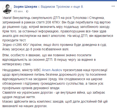 Позже советник главы МВД Зорян Шкиряк сообщил, что Найду задержали. Внимание! "Виновник смертельного ДТП на углу Туполева и Стеценко, задержан в рамках статьи 208 УПК. Он будет находиться под стражей до решения суда, определит меру дальнейшую меры пресечения. Кроме того, по последней информации, правонарушитель все-таки сдал анализ для экспертизы на содержание алкоголя. На месте ДТП, он отказаться проходить тест," - написал он.