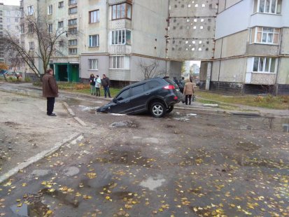 В Сумах вчера днем, 13 ноября, около 12.00 во дворе на пр. Лушпы, 11 автомобиль провалился в дыру в асфальте, оставленную коммунальщиками после прорыва водопровода. Об этом сообщает местное издание Dancor.