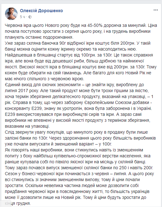 Одновременно Дорошенко отмечает, что украинцы также могут сэкономить и найти икру, произведенную до июля 2017 года, но такой продукт будет значительно уступать по качеству, ведь он содержит консервант E239, который из-за запрета Европейским Союзом также был запрещен в Украине. А сейчас сами производители не уверены в высоком качестве продукта с этим консервантом, несмотря на сроки хранения, указанные на упаковке.