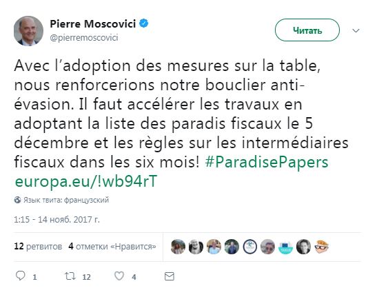 "Я настоятельно призываю государства-члены принять его на следующем заседании совета министров экономики и финансов стран ЕС 5 декабря. 5 декабря у нас должен быть черный список налоговых гаваней", - сказал он в Twitter.