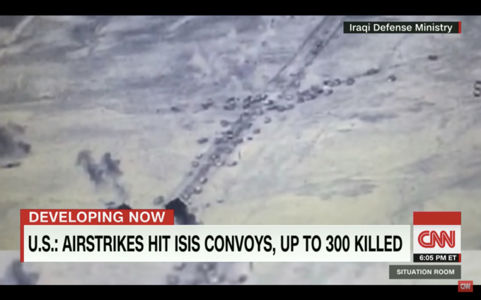 Более того, другое "фотодоказательство" с грузовиками ИГИЛ взято из американской хроники бомбардировок в районе Фаллуджа в 2016 году. Тогда авиаудары США уничтожили около 200 грузовиков террористов.