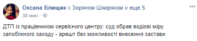 "ДТП с сотрудником сервисного центра: суд избрал водителю меру пресечения - арест без возможности внесения залога", - написала она.