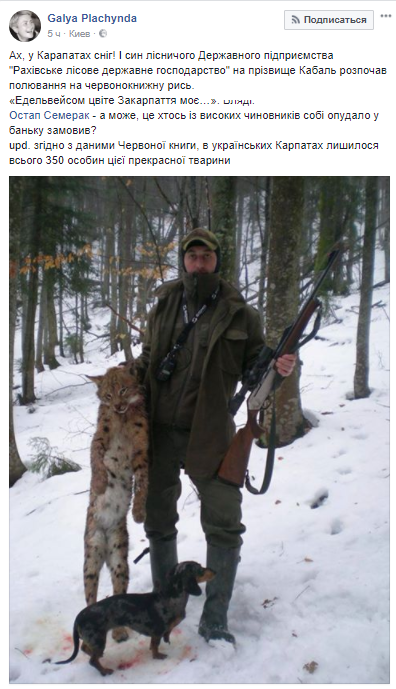 Информация и фото о депутате Раховского горсовета от Радикальной партии Михаиле Кабале, который вместе с отцом-лесником убили краснокнижную рысь в Карпатах, появилась от родственника другого браконьера Василия Шемоты, который также является местным депутатом от БПП и возглавляет Трибушанское отделение Биосферного заповедника. Об этом сообщают "Вести".