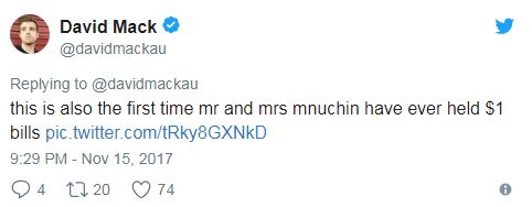 "Это первый раз, когда господин и госпожа Мнучин держат в руках банкноты в $1", - написал пользователь Дэвид Мак.