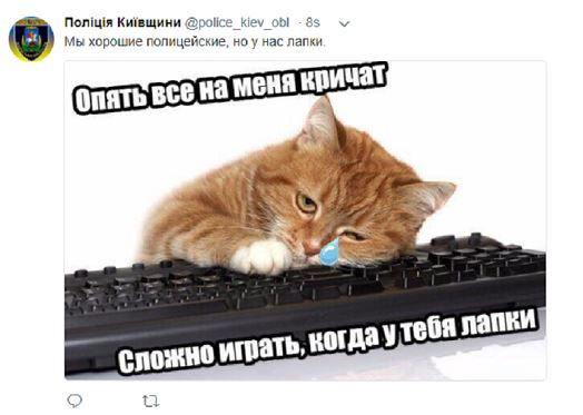 Неизвестные взломали Twitter-аккаунт полиции Киевской области и разместили в нем картинку с изображением грустного кота и надписью "Мы хорошие полицейские, но у нас лапки". Об этом сообщает InternetUA.