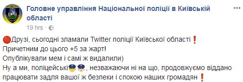 "Друзья, сегодня взломали Twitter полиции Киевской области! Причастных к этому +5 за шутку! Опубликовали мем и сами удалили) Ну а мы, полицейские, несмотря ни на что, продолжаем преданно работать ради вашей же безопасности и спокойствия наших граждан", - говорится в заметке на официальной странице полиции Киевской области в Facebook.