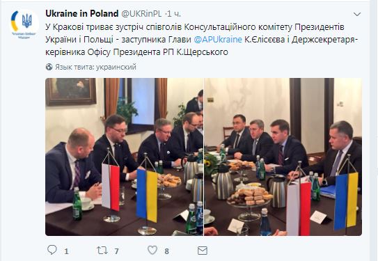 В польском Кракове проходит встреча консультационного комитета Украины и Польши. Об этом сообщает украинское посольство в Польше в своем Twitter.