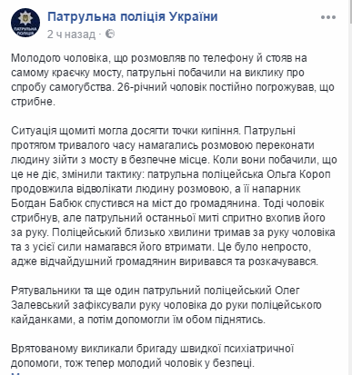 "Патрульная полицейская Ольга Карп продолжила отвлекать человека разговором, а ее напарник Богдан Бабюк спустился на мост к гражданину. Тогда мужчина прыгнул, но патрульный последний момент схватил его за руку. Полицейский около минуты держал за руку мужчину и изо всех сил старался его удержать. Это было непросто, ведь отчаянный гражданин вырывался и раскачивался", - говорится в сообщении.