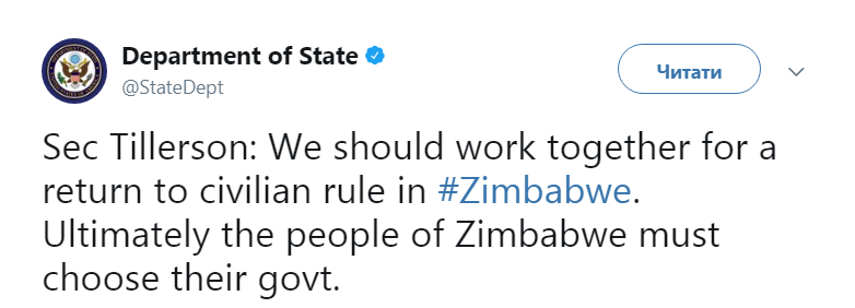 Госсекретарь США Рекс Тиллерсон заявил, что власть в Зимбабве должна вернуться в руки граждан. Это произошло спустя несколько дней после отстранения военными президента Зимбабве Роберта Мугабе.